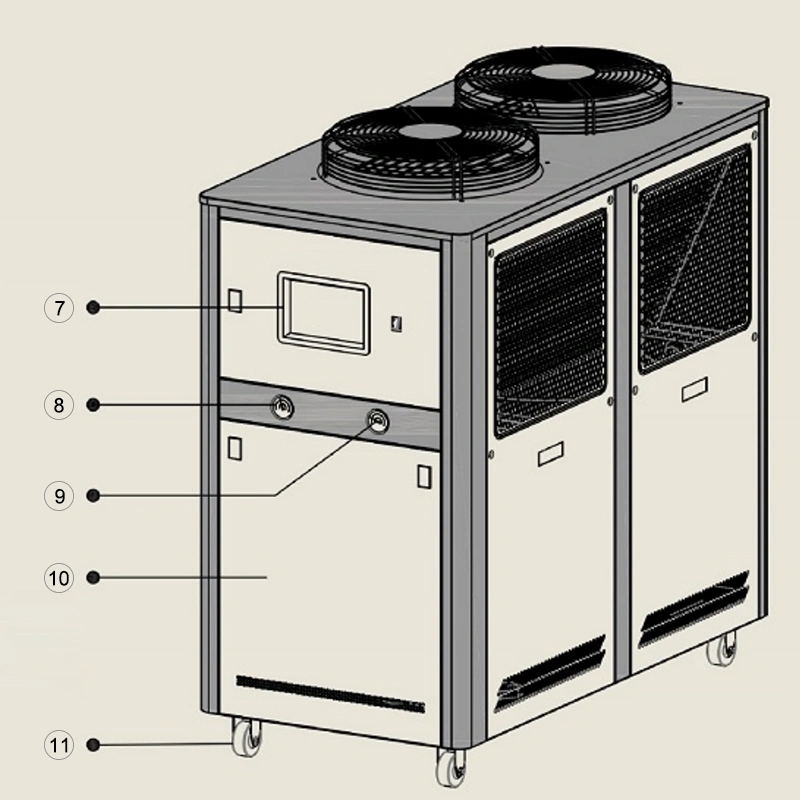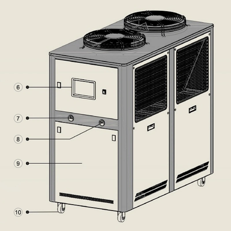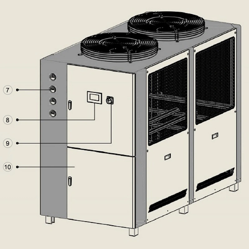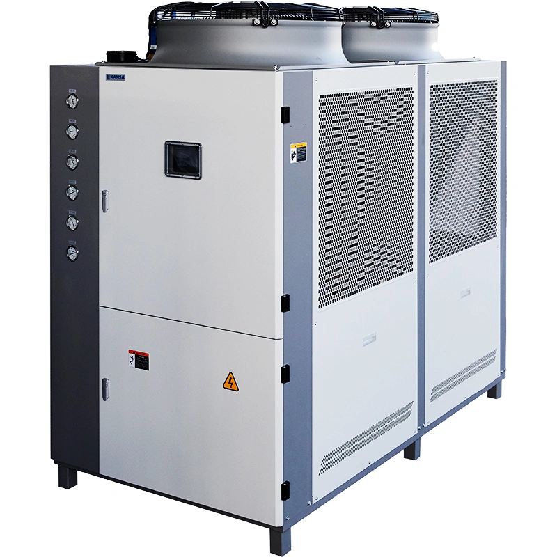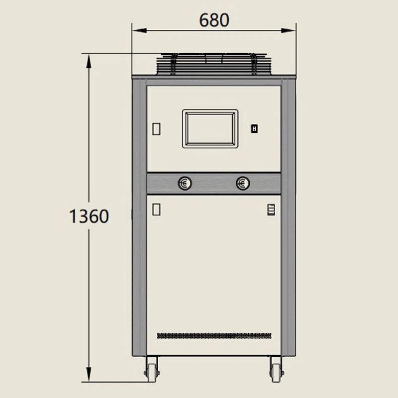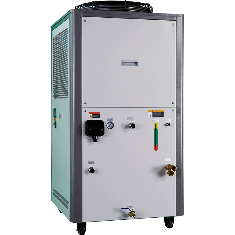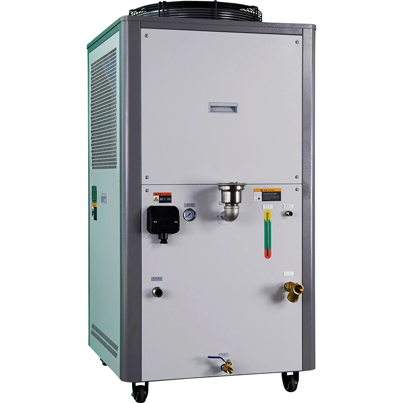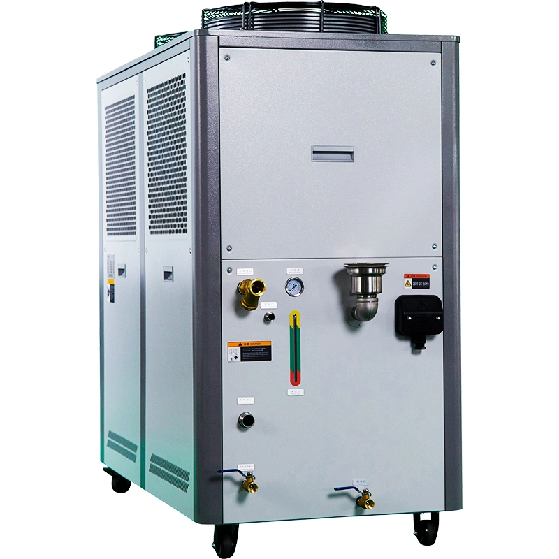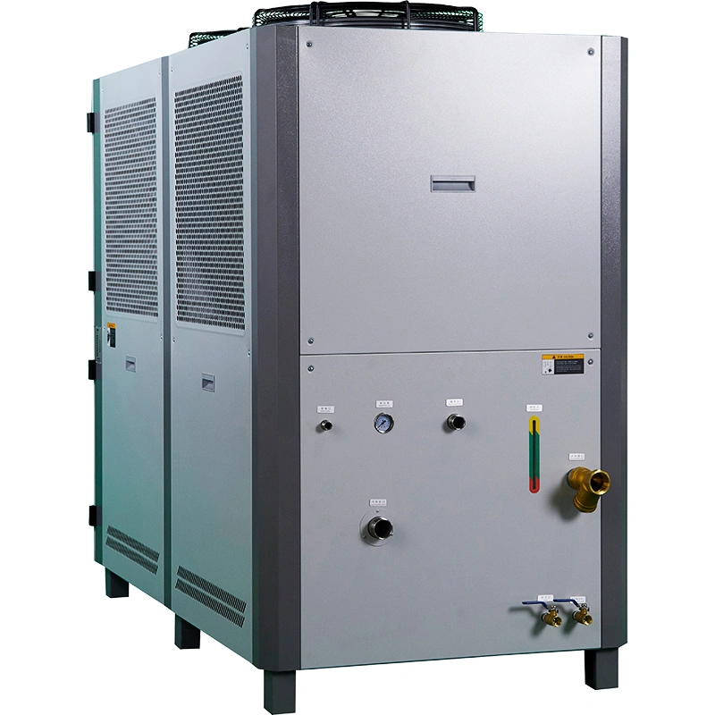 The air-cooled industrial chiller uses ambient air as its cooling source, eliminating the need for a cooling tower or dedicated machine room. It features simple installation, compact structure, and efficient use of space and water resources. The chiller operates with stable performance and precise temperature control, making it widely applicable in temperature regulation for injection molding, chemical processing, laser manufacturing, and food processing industries.