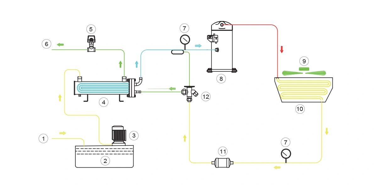 The cutting fluid (coolant) chiller is a dedicated support unit for CNC machine tools and machining centers. It continuously cools cutting fluid through forced refrigeration, helping maintain tool hardness, extend tool life, and ensure machining accuracy by preventing thermal deformation caused by high temperatures. Additionally, it inhibits bacterial growth, prolongs the service life of the cutting fluid, and is a key auxiliary device for improving the quality and efficiency of automated machining processes.